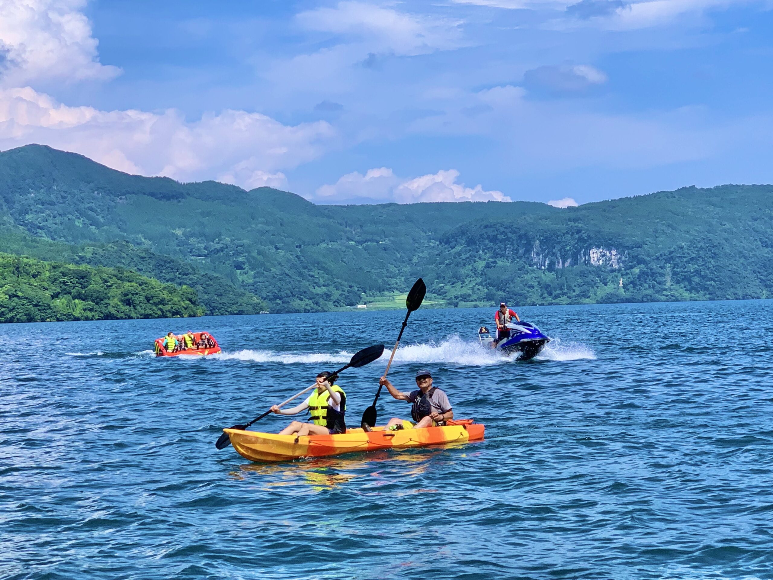 池田湖水上アクティビティ体験総合施設。ホバーボードやウェイクサーフィンなど、世界中で大人気の水上アクティビティをご家族やグループで楽しめます。それぞれの体験には、水上キャリア約20年のベテランインストラクターが付くので、安心してお楽しみください。また、ミニジープや四輪バギーのレンタルもあります。 -