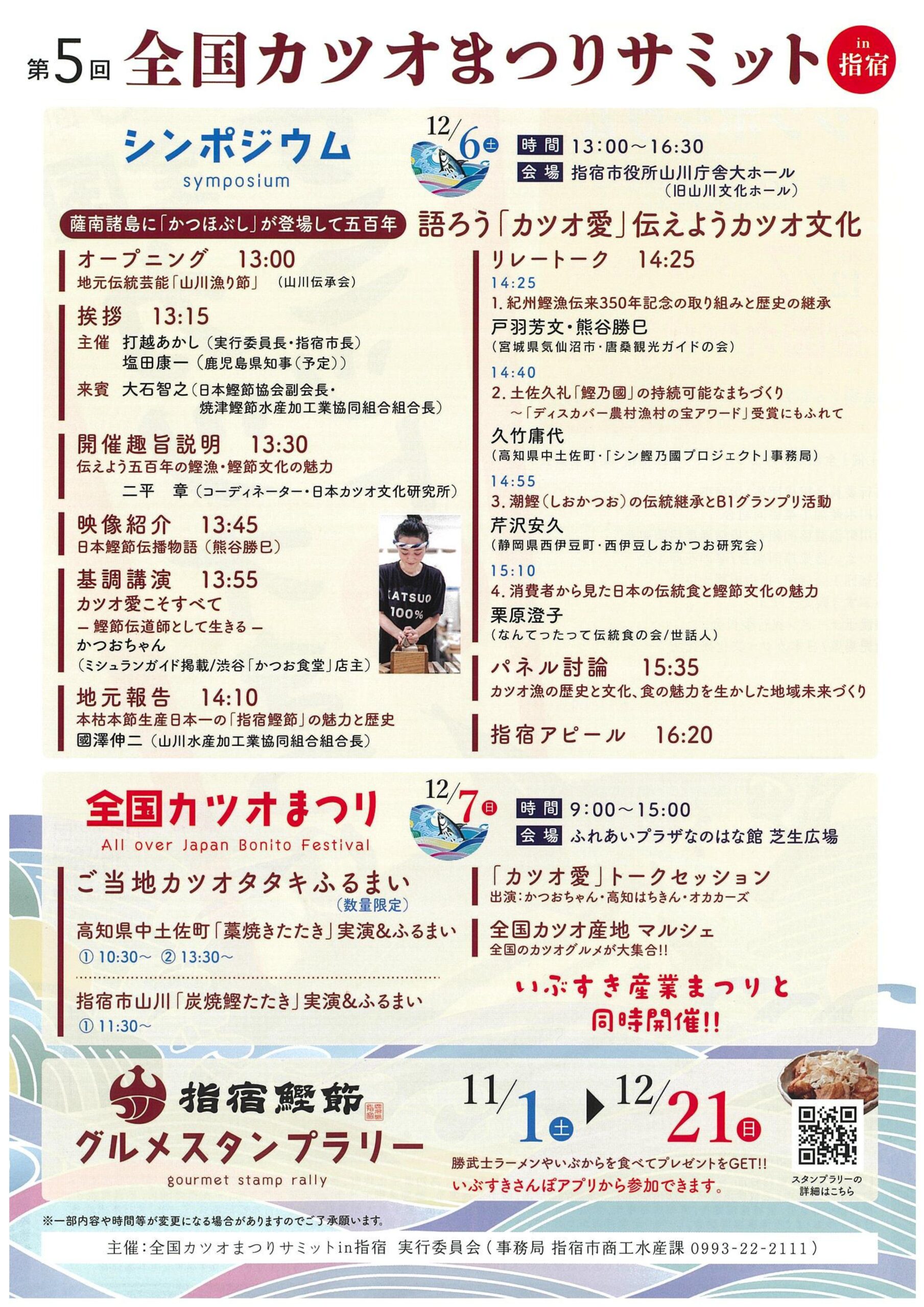2025年12月6日(土)、7日(日)に、第5回 全国カツオまつりサミットが指宿市で開催されます! 本市の重要な基幹産業である鰹節製造業。特に鰹節の最高級品である本枯本節は本市が全体の7割を製造しているほか、ユネスコ無形文化遺産である和食文化を支える「指宿鰹節」の魅力を発信することで、認知度向上や消費拡大を目指します。 また、カツオがこれまでもたらしてきた恵みや文化、歴史、食としての魅力を全国に発信し、全国のカツオ産業の発展を目指します。 【シンポジウム】 開催日:2025年12月6日(土) 時 間:13:00~16:30 会 場:指宿市役所山川庁舎大ホール(旧山川文化ホール) 【全国カツオまつり】 開催日:2025年12月7日(日) 時 間:9:00~15:00 会 場:ふれあいプラザなのはな館芝生広場※いぶすき産業まつりと同時開催 |