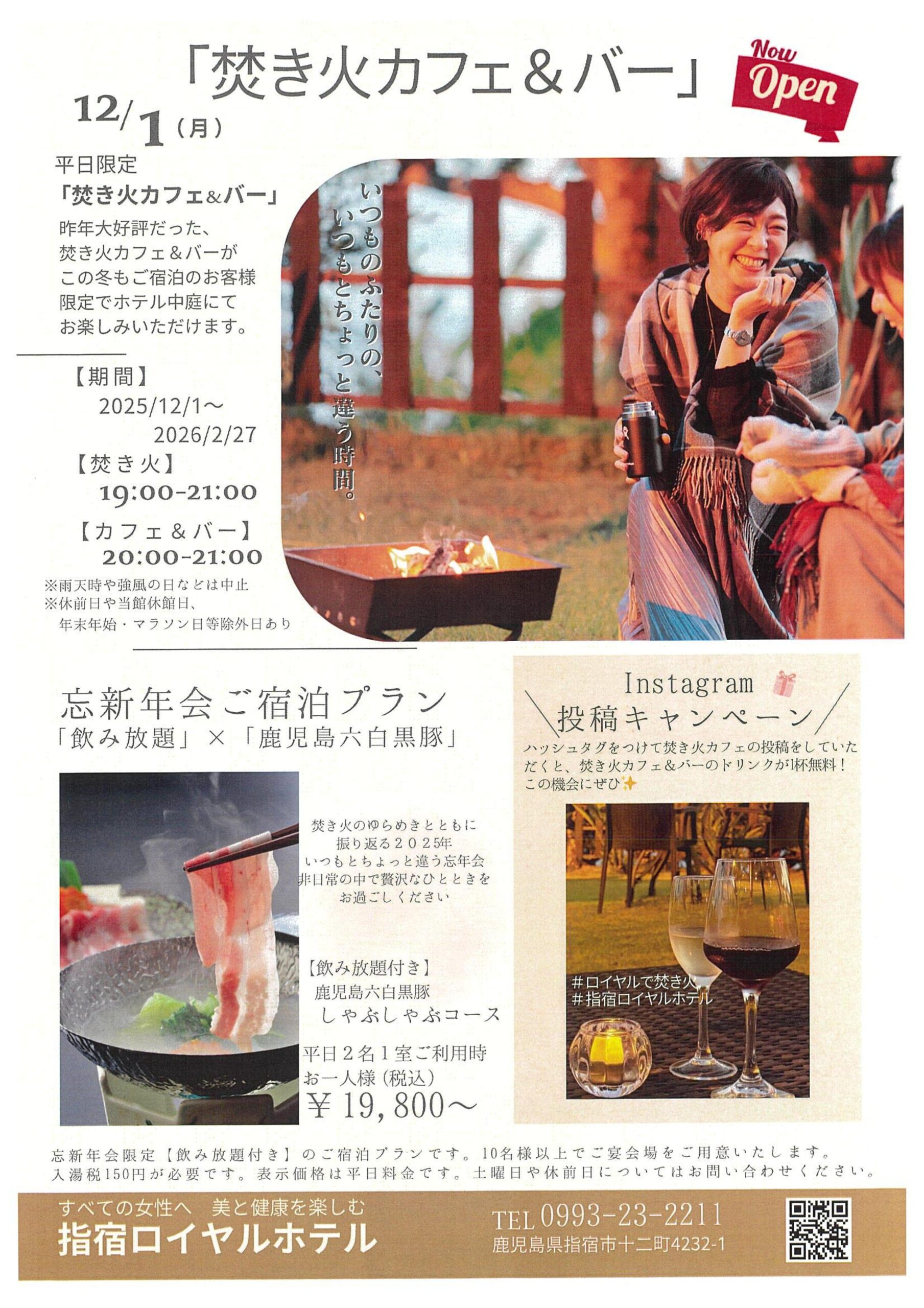 指宿ロイヤルホテル 冬季限定「焚き火カフェ&バー」・忘新年会のご案内