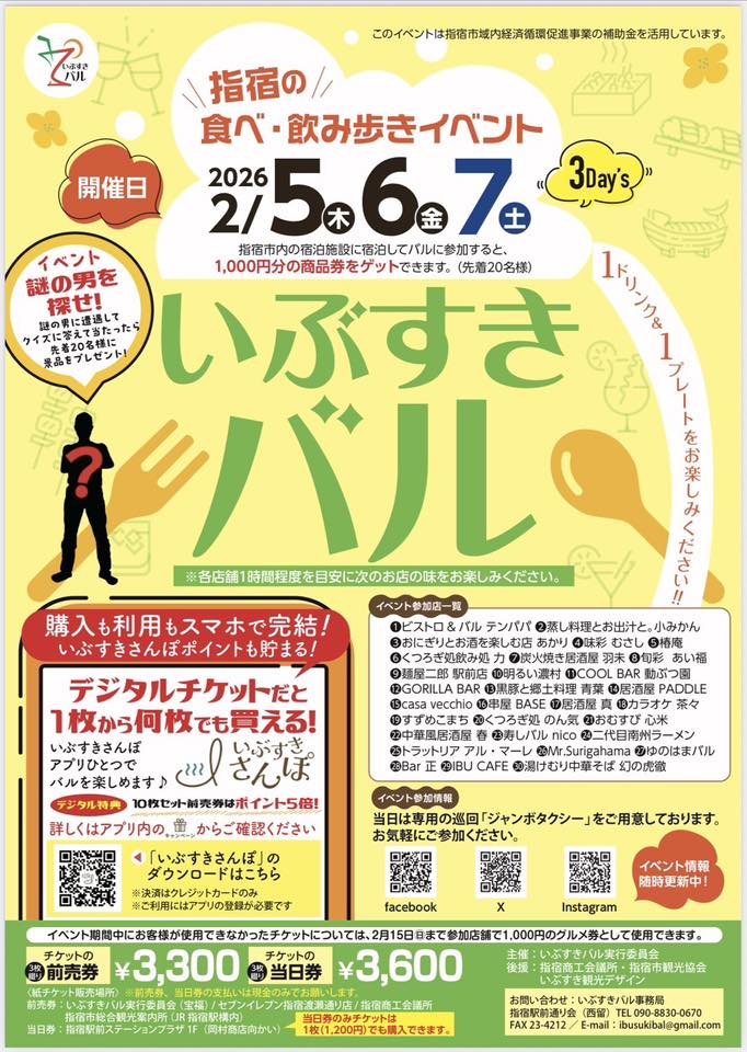 いぶすきバル事務局 指宿駅前通り会 西留 TEL 090-8830-0670 FAX 0993-23-4212 |