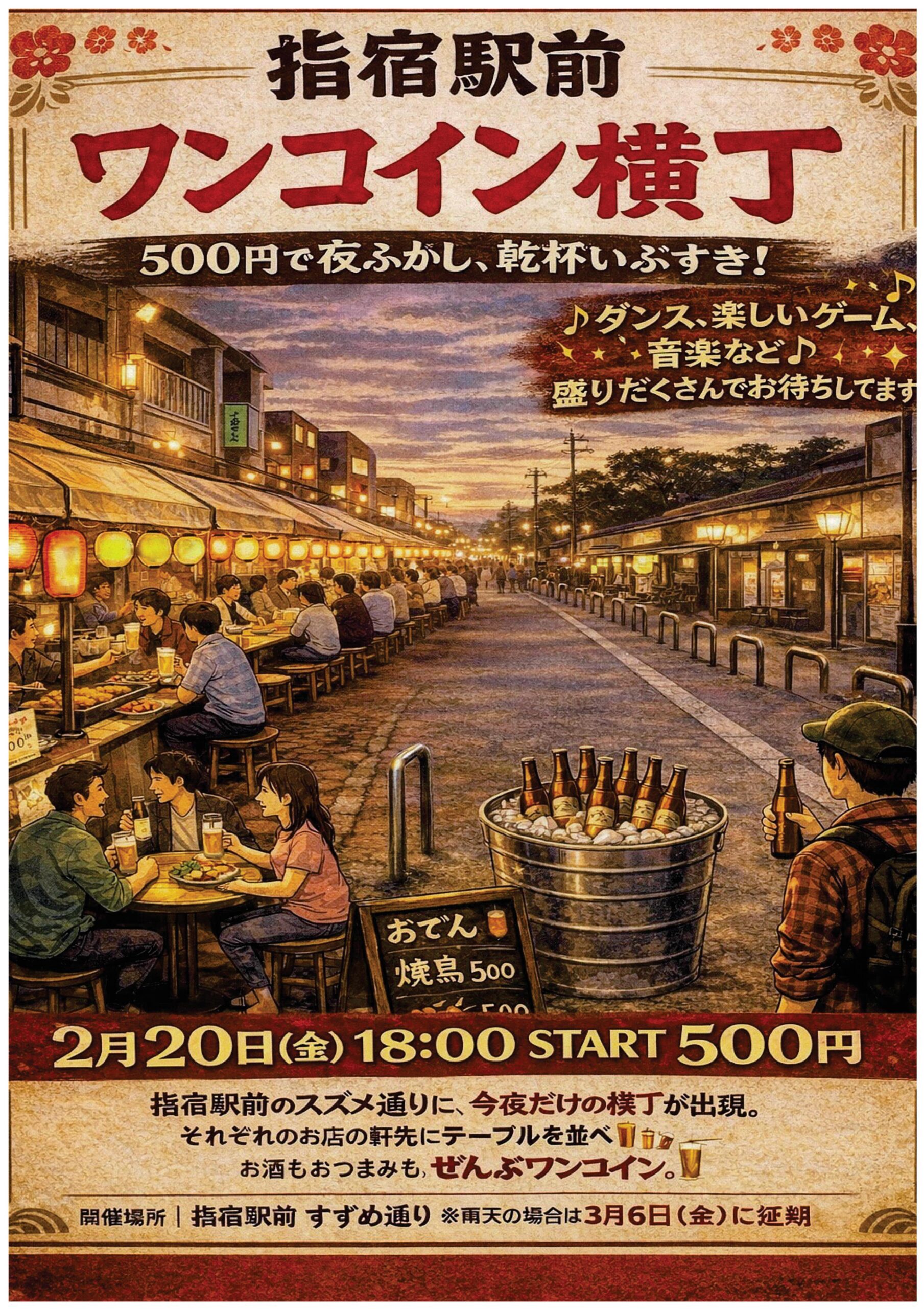 指宿駅前・すずめ通りに、一晩限りの横丁が出現いたします。