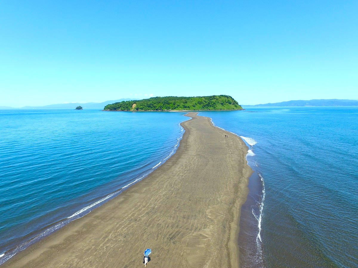 鹿児島湾(錦江湾)に浮かぶ美しい無人島。 3月から10月にかけての大潮または中潮の干潮時の限られた時間だけ、長さ約800mのちりりんロード(砂州)が出現し、知林ヶ島に歩いて渡ることができます。 ※島に渡る際は、必ず砂州の出現予測を確認し、時間に余裕をもって大自然をお楽しみください。 -